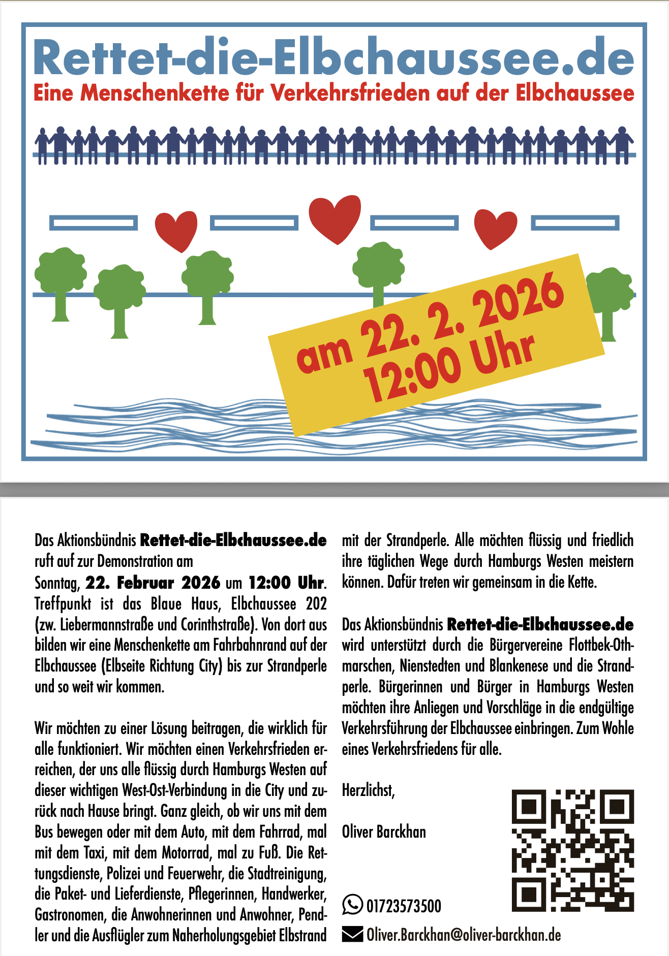 Wir demonstrieren am Sonntag, 22. Februar 2026 um 12:00 Uhr fรผr Verkehrsfrieden auf der Elbchaussee. Dazu verteilen wir bereits eine Postkarte mit dem Aufruf zur Menschenkette.